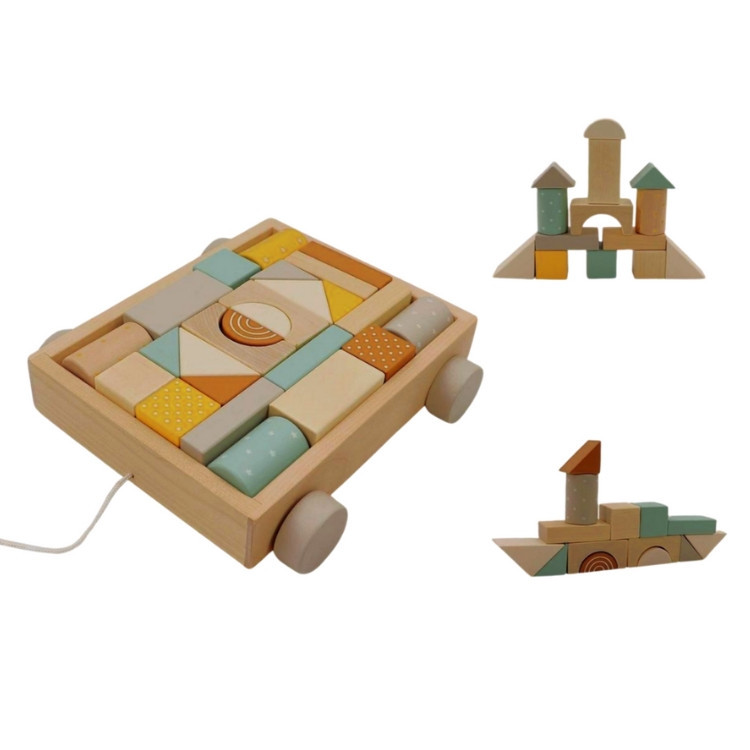Húzogatós kiskocsi színes építőkockákkal. A kocsi a kockák tárolására is alkalmas, mely ösztönzi a gyermeket a rend szeretetére. Az építőkockák játékosan segítenek a színek, formák elsajátításában. Fejleszti a finommotorikus mozgást és a koncentrációt, emellett remek szórakozás a kicsiknek.
