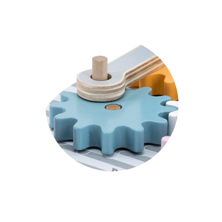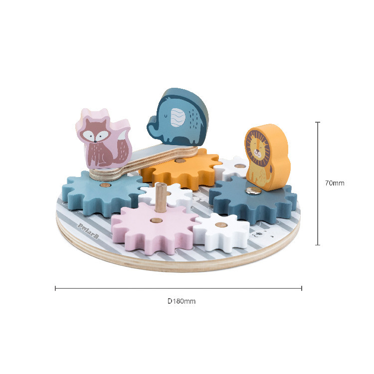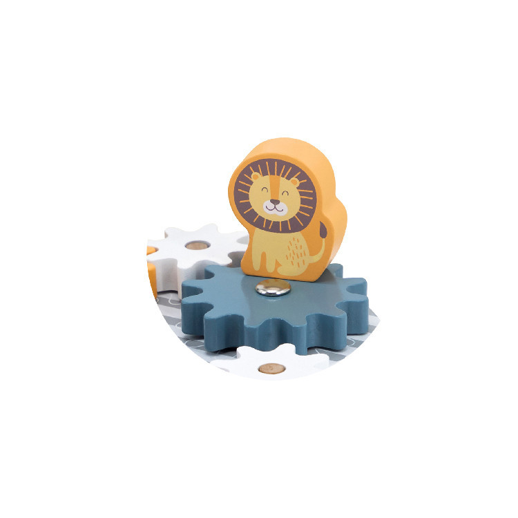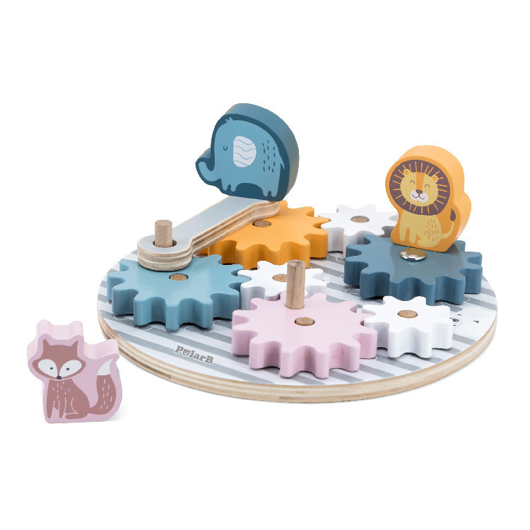 Fából készült színes erdei állatok fogaskerekeken. A játék a mindenki által ismert fogaskerekeken alapszik, melyekre felhelyezhetőek az aranyos állatok. Fejleszti a gyermekek finommotorikus készségét és szem-kéz koordinációját. Segít a problémamegoldó készség és az összefüggések felismerésének fejlődésében. Ezeken felül ismereteti és gyakoroltatja az állatok és színek elnevezéseit.