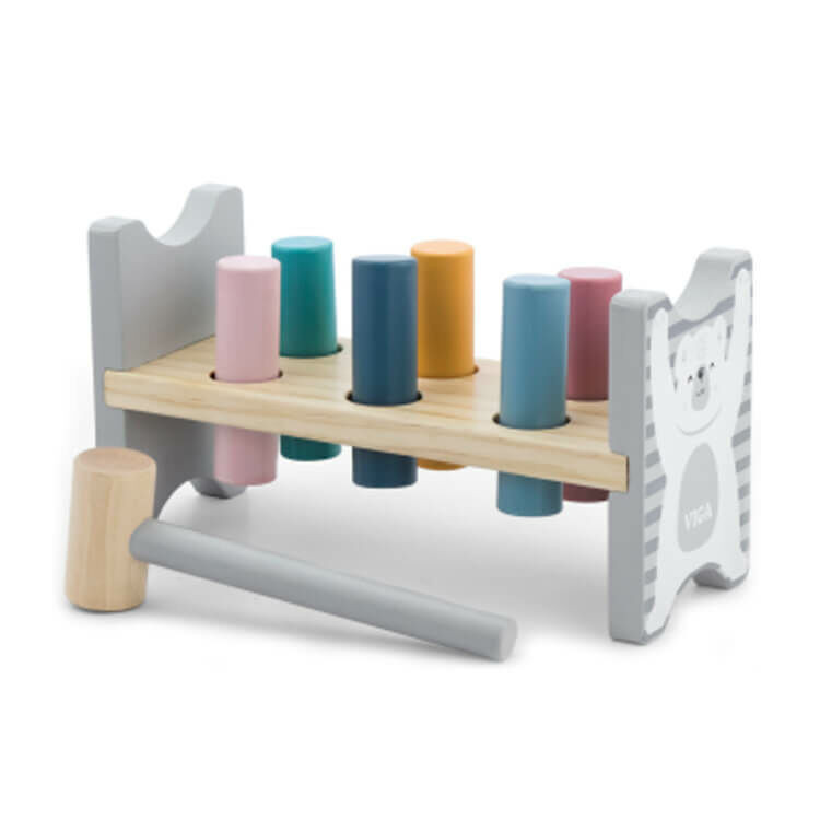 Pasztell színű kalapáló játék fahengerekkel. A mellékelt kalapács segítségével a hengereket kell egyre mélyebbre ütni. Amint minden henger a helyére került a keret megfordításával folytatódhat a móka tovább. Mialatt a gyermekek remekül szórakoznak, fejlődik a finommotorikus képességük és szem-kéz koordinációjuk. Mindezek mellett kiválóan alkalmas a színek és számok játékos elsajátításához.