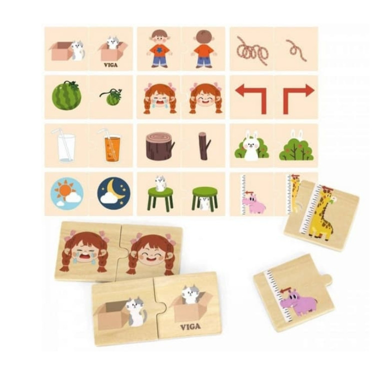 A Viga Toys Ellentétek puzzle egy szórakoztató, ugyanakkor kifejezetten fejlesztő fajáték, amely segít a kicsiknek megérteni az alapvető ellentétpárokat a mindennapi életből. A készlet 24 darab, színes, képekkel ellátott fa lapkát tartalmaz, amelyekből 12 logikusan összetartozó pár rakható ki.