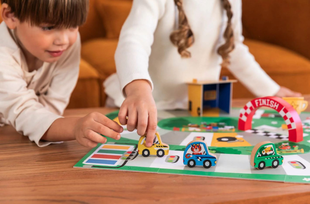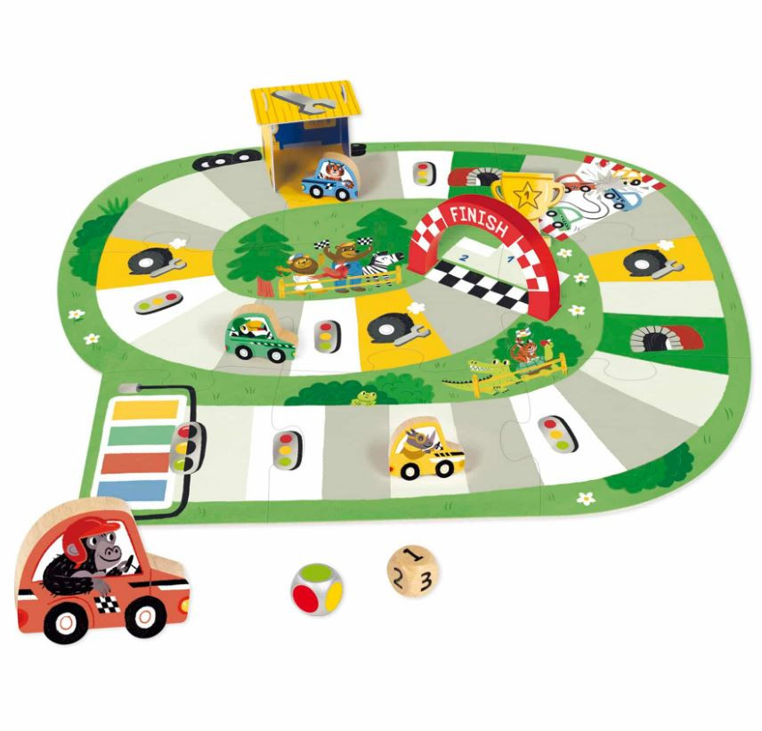 A Goula autóversenyzős társasjátéka a gyerekek nagy kedvence lesz, hiszen a színes pályán, kedves kis autókkal versenyezhetnek egymással.