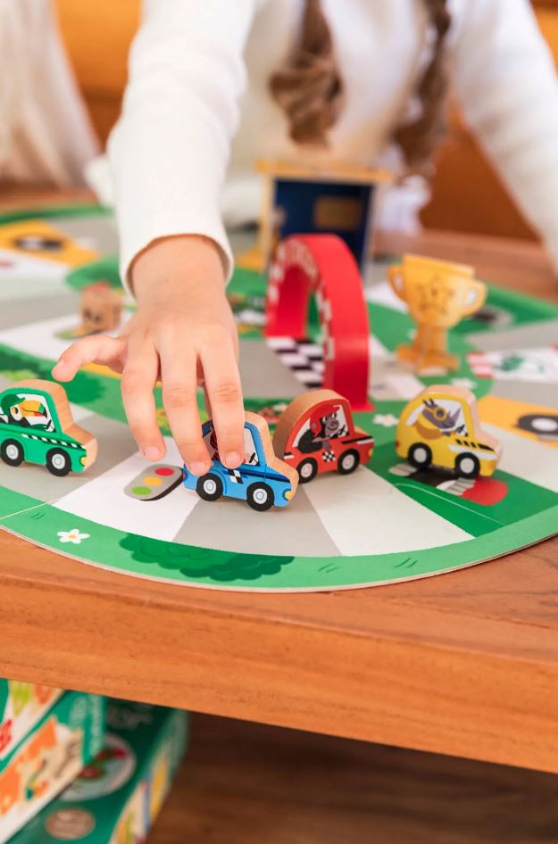 A 4 db színes versenyautót különböző állatkák vezetik, így igazán mókás hangulatot kelt a készlet.
