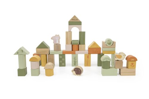 Fa építőkocka szett, amely 50 darab színes elemet tartalmaz különböző mintákkal. Örök kedvenc, nem hiányozhat egy gyermekszobából sem. Ez a nagyszerű építőjáték alkalmas egyéni játékra, de csoportosan is alkalmazható. Nem kell hozzá más, csak egy kis kreativitás és ügyesség. Fejleszti a gyermek finommotorikus készségeit és kreativitását. Egy kis fantáziával csodaszép várakat, házakat, hidakat lehet a sokféle színű és formájú építőkockákkal építeni.