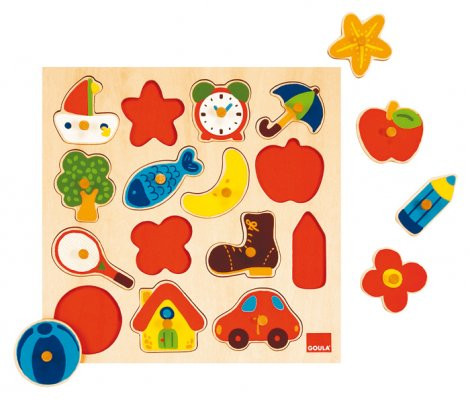 Ezek a fából készült fogantyús puzzle-k a legkisebbek kézügyességét, formafelismerését fejlesztik.