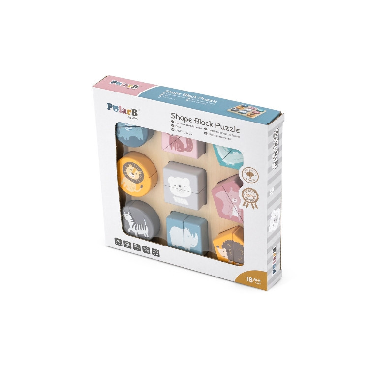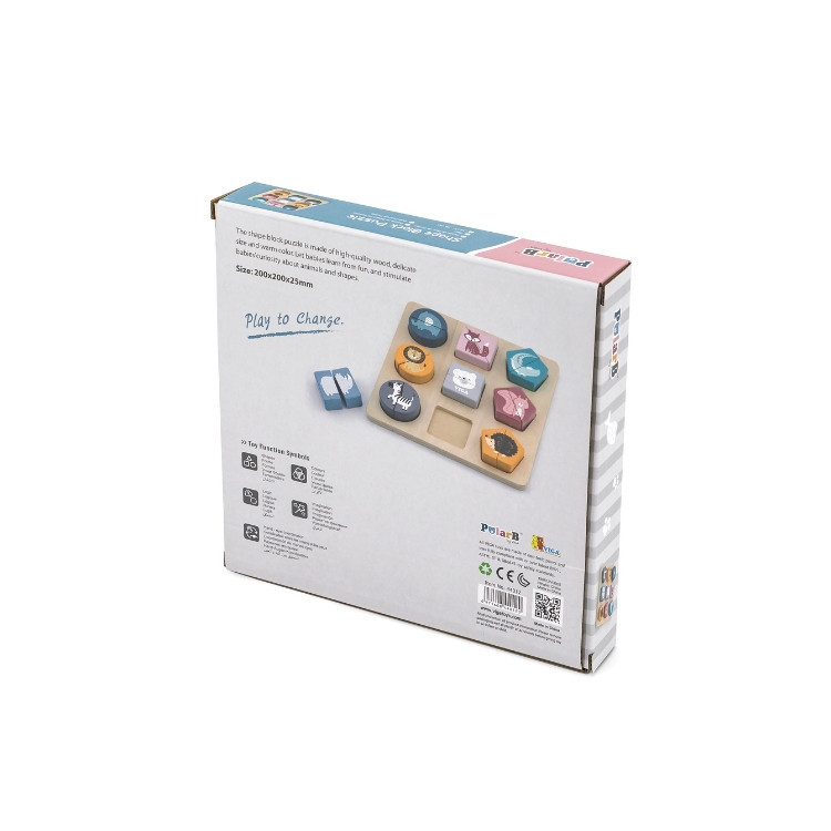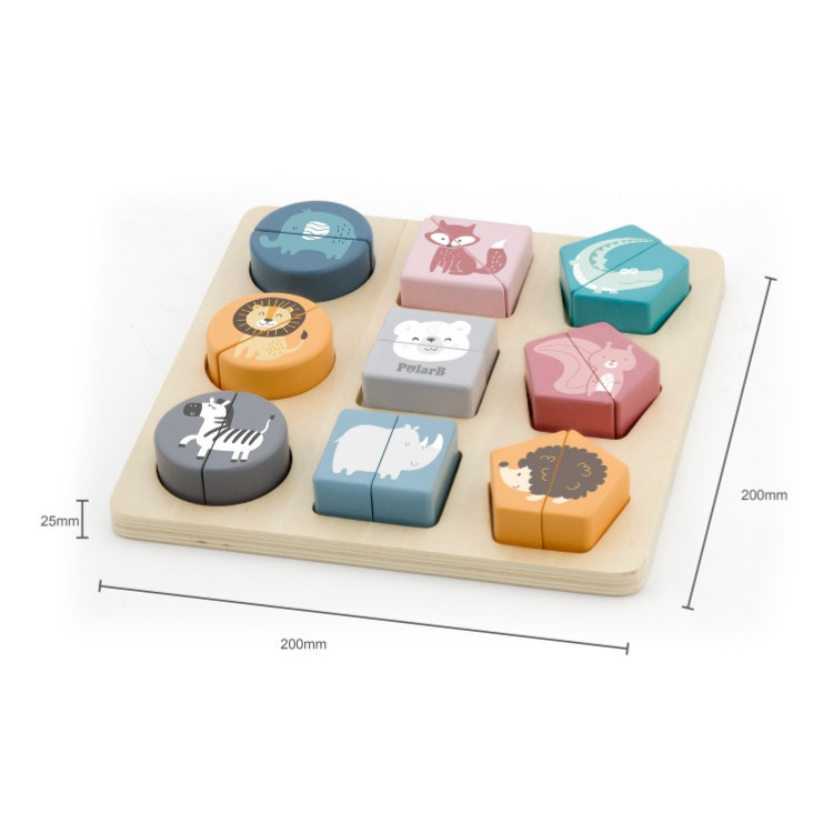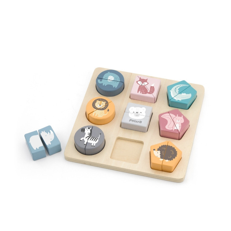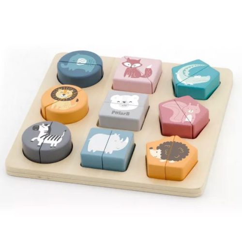 Készségfejlesztő játék, geometriai elemeken ábrázolt vadállatokkal, gyönyörű pasztell színben. A játék lényege a különböző formák párjainak megtalálása és beillesztése a megfelelő helyre. Kiváló szórakozást biztosít a kicsiknek, miközben elsajátíthatják a színeket, formákat és az állatok neveit. Ezen kívül fejleszti a szem-kéz koordinációt, a memóriát, formafelismerést, rész-egész fogalmát.