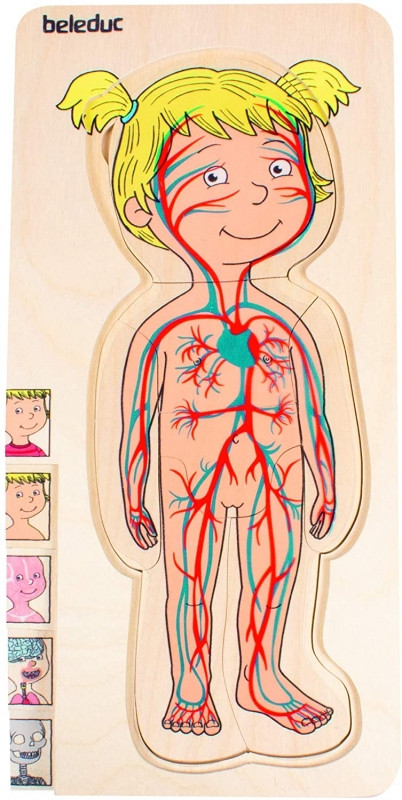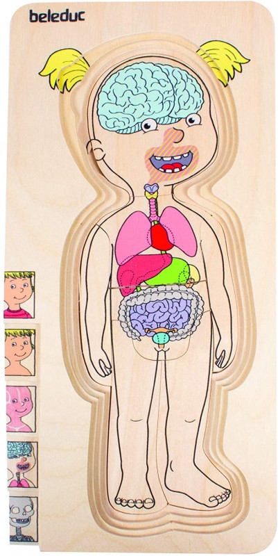 A Beleduc rétegpuzzle játéka izgalmas módon mutatja be az emberi test összetételét, 5 különböző rétegre bontva azt. Csontrendszer, belsőszervek, izomzat, keringési hálózat, bőr és ruházat.