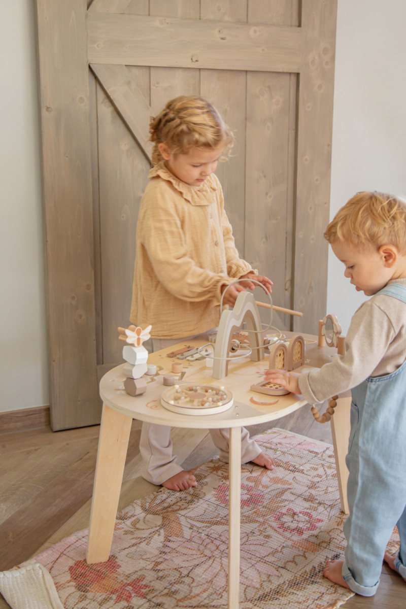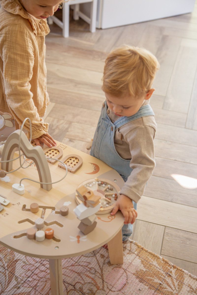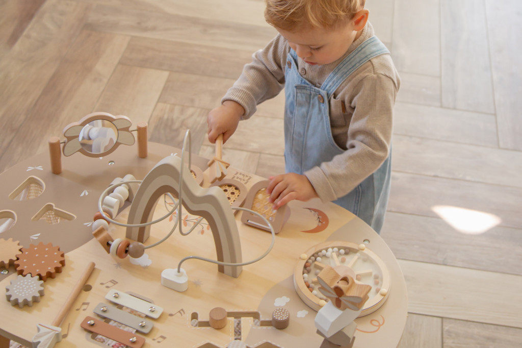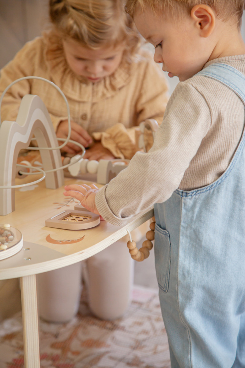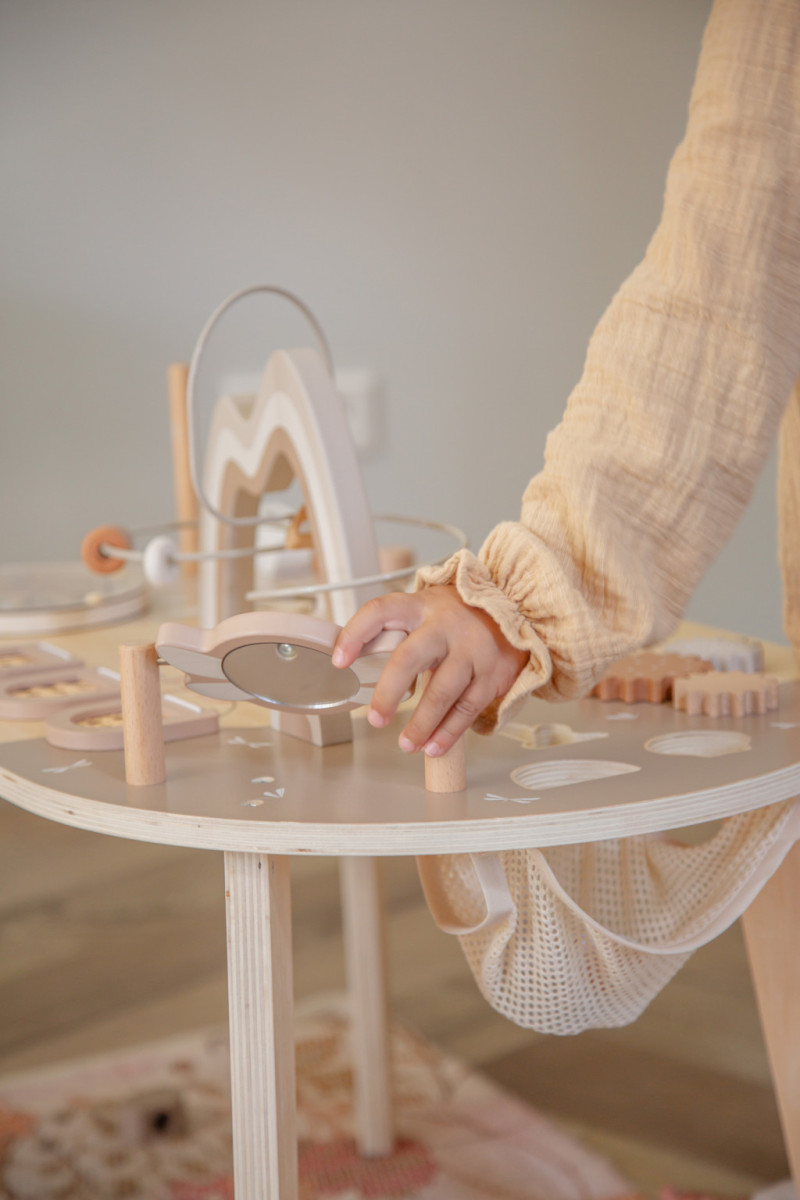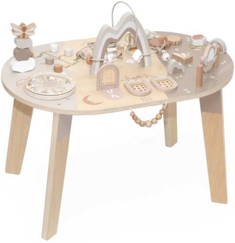 A Label Label interaktív foglalkoztató asztal nemcsak rengeteg szórakozást nyújt, de a prémium minőségű fa és a gondosan kidolgozott, biztonságos felületek révén tartós és megbízható játékpartner is.