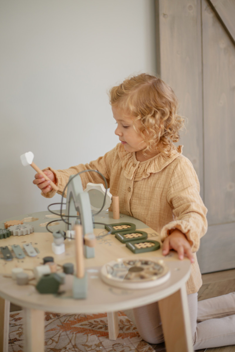 Ez a gyönyörű, természetes oliva zöld activity asztal sokkal több, mint egy egyszerű bútor a gyerekszobában.