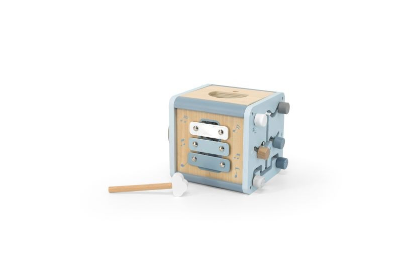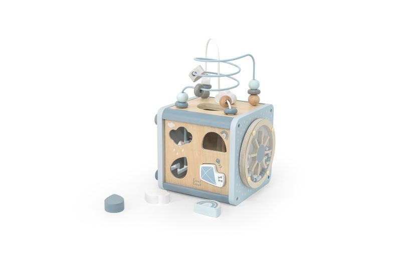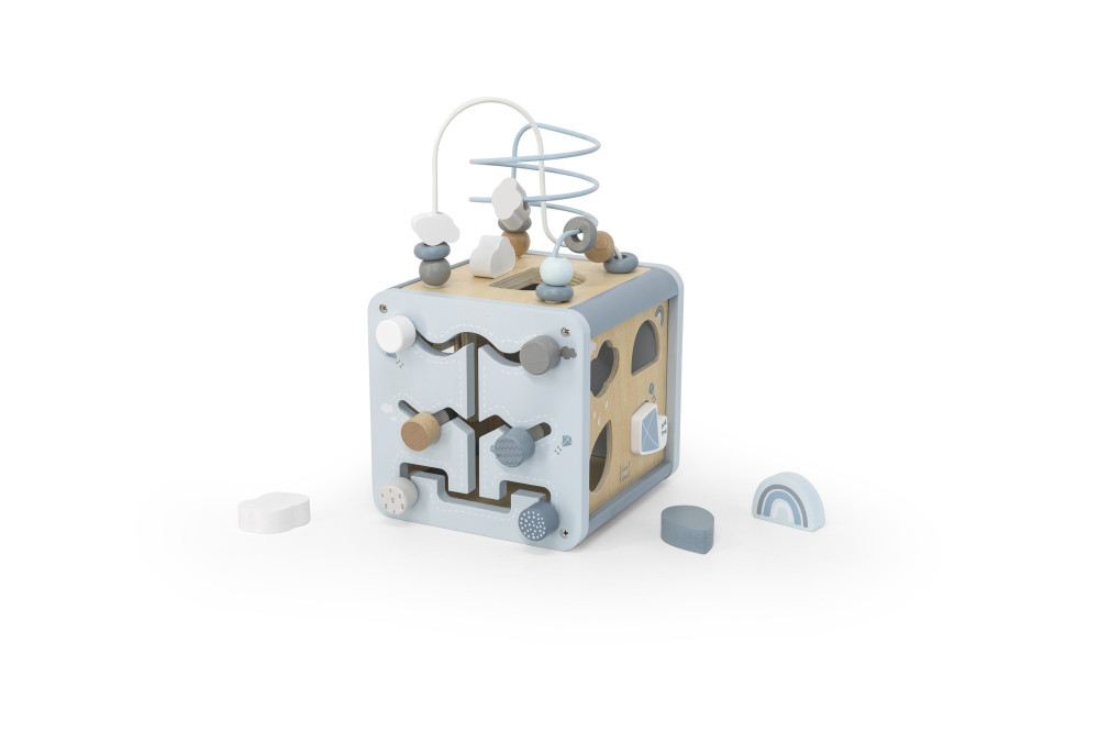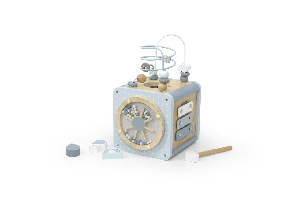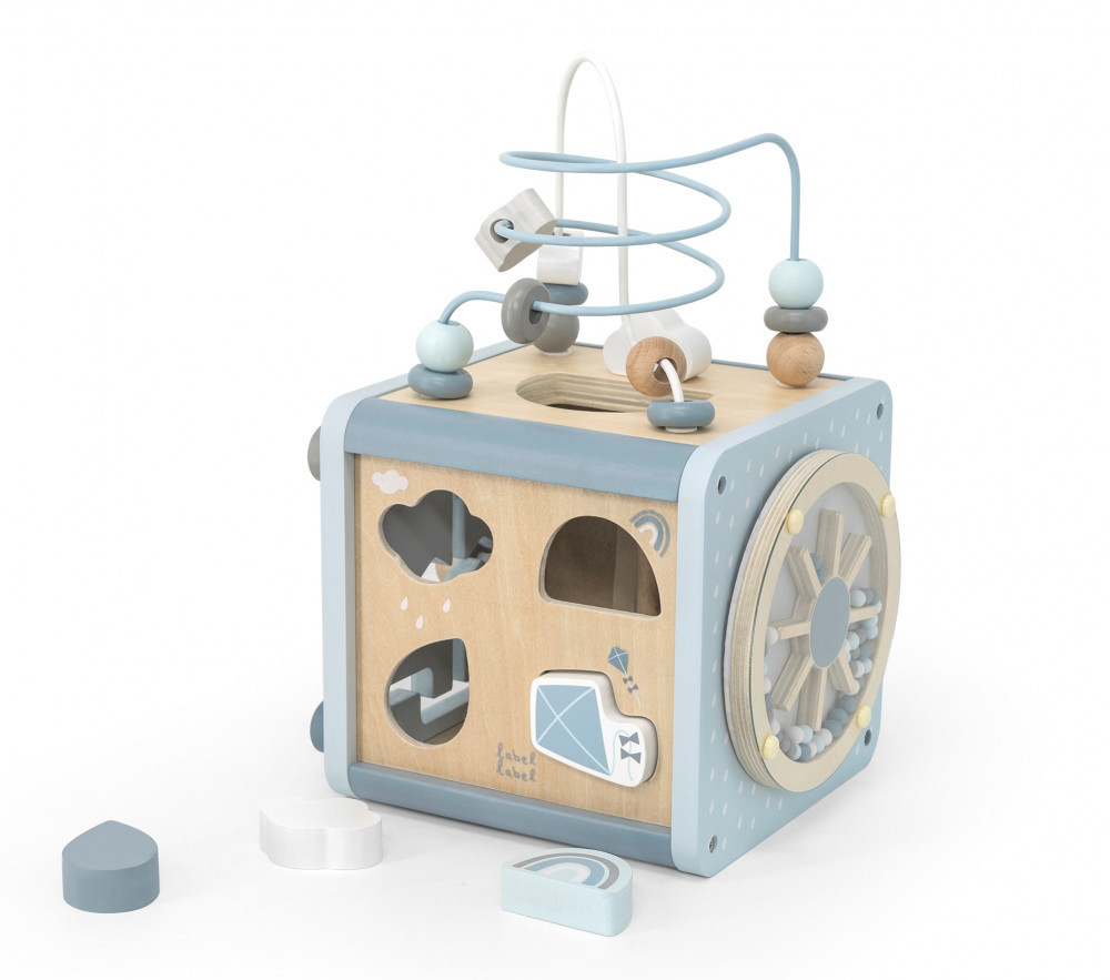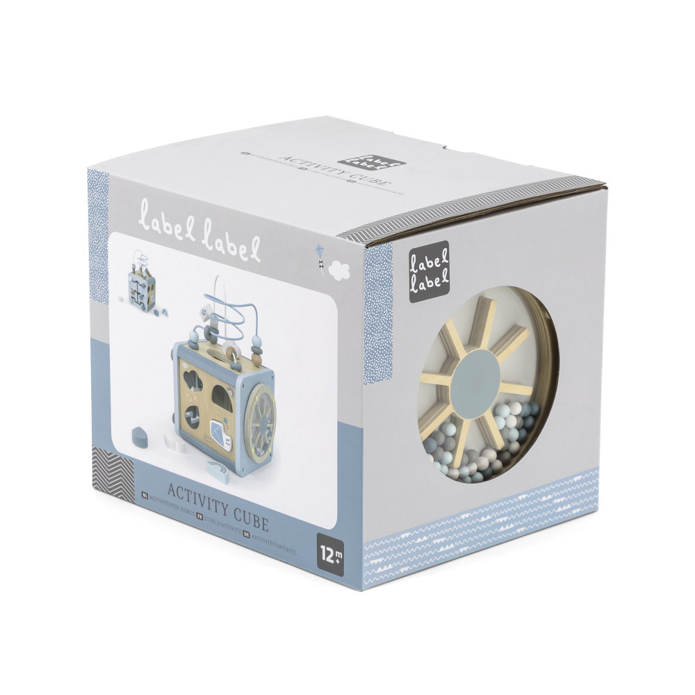 Az Label Label tevékenység kockája egy 5 az 1-ben játék. Megtalálható benne a formaválogató, fogaskerekek, pályalabirintus, xilofon és gyöngyök labirintusa. A kicsiket mind-mind fejlesztő és szórakoztató játékra inspirálja. A golyóvezető labirintus leválasztható a kockáról, így két külön játékká válik. A többfunkciós játék rengeteg minőségi játékidőt kínál. Serkenti a kreativitást és a logikus gondolkodást, a finommotorikát, valamint segíti a formák, színek, számok, megismerését és a párosítási készségének elsajátítását.