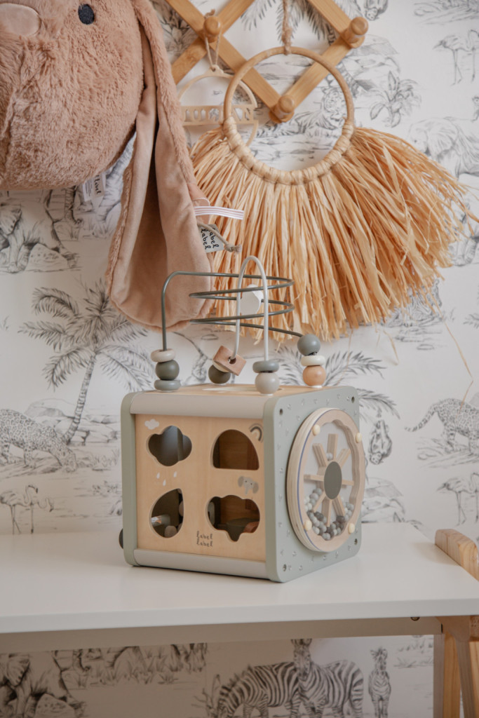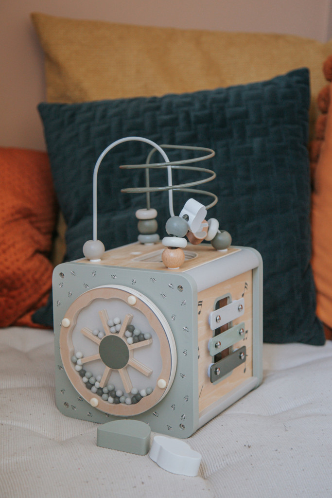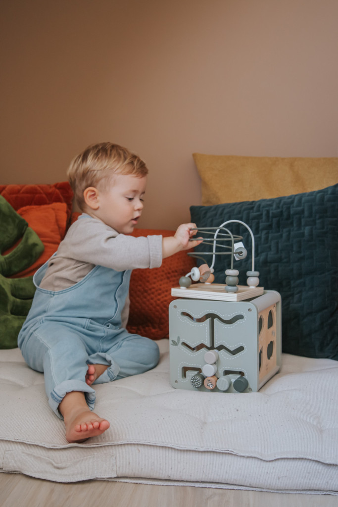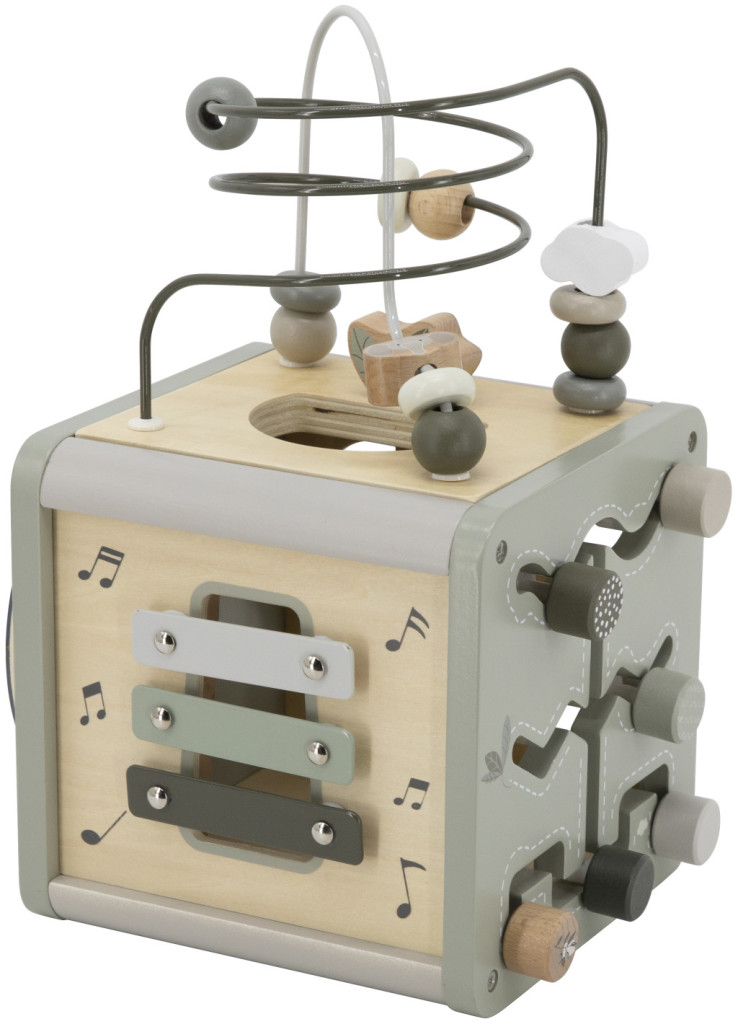 Az Label Label kellememes oliva zöld színű tevékenység kockája egy 5 az 1-ben játék. Megtalálható benne a formaválogató, fogaskerekek, pályalabirintus, xilofon és gyöngyök labirintusa. A kicsiket mind-mind fejlesztő és szórakoztató játékra inspirálja. A golyóvezető labirintus leválasztható a kockáról, így két külön játékká válik.