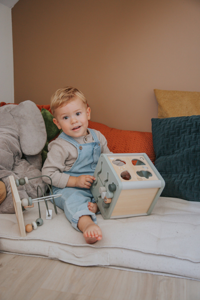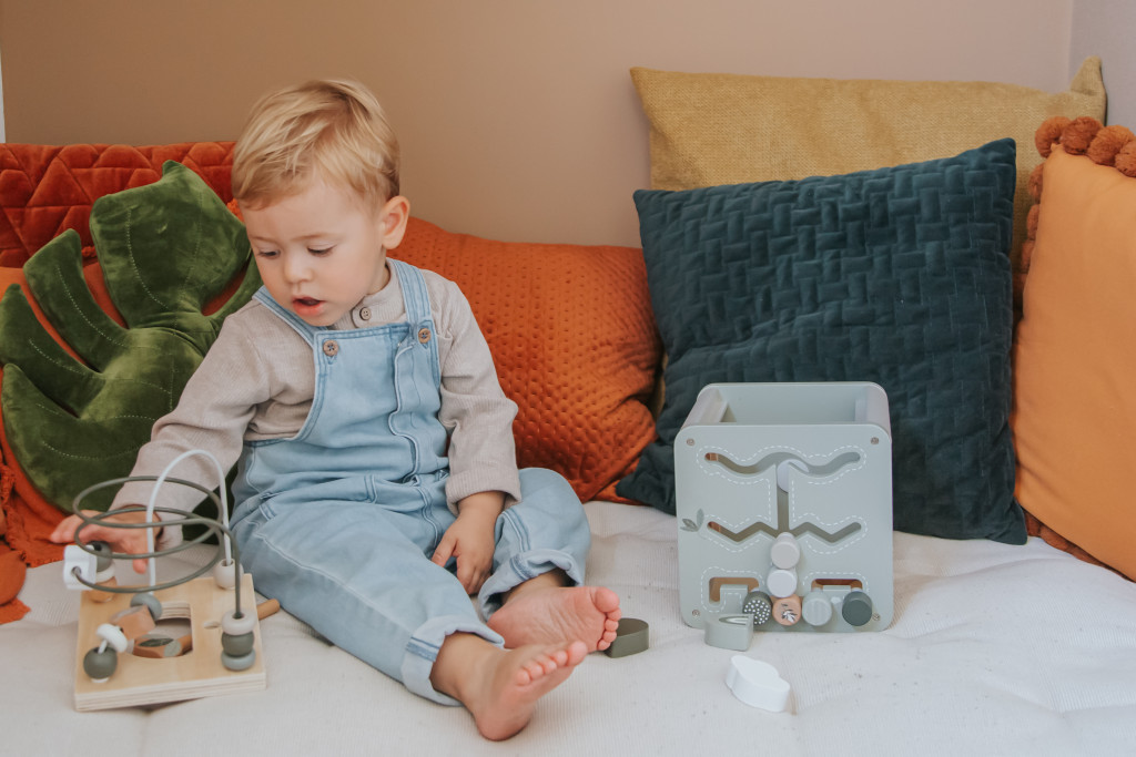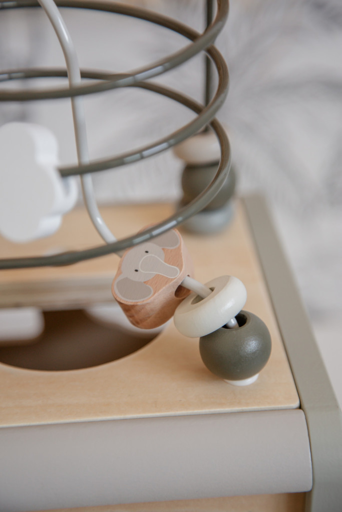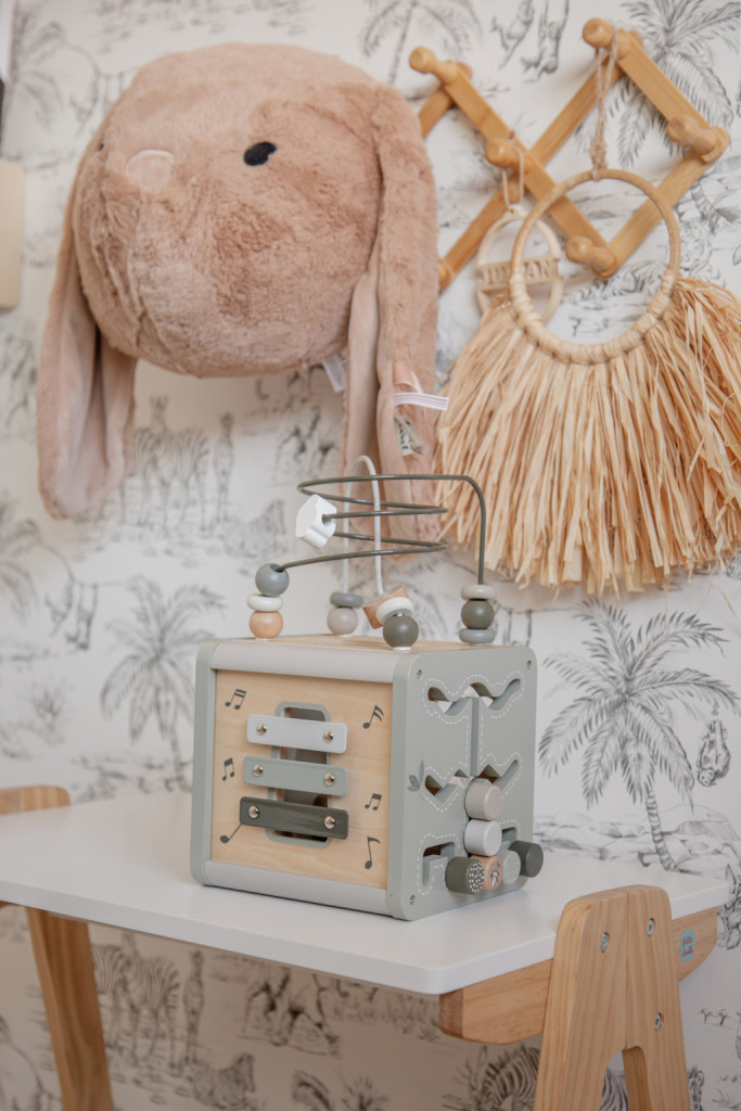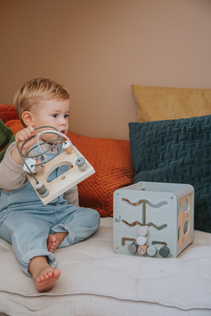 Az Label Label kellememes oliva zöld színű tevékenység kockája egy 5 az 1-ben játék. Megtalálható benne a formaválogató, fogaskerekek, pályalabirintus, xilofon és gyöngyök labirintusa. A kicsiket mind-mind fejlesztő és szórakoztató játékra inspirálja. A golyóvezető labirintus leválasztható a kockáról, így két külön játékká válik.