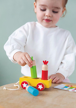 A Goula vonatos játéka 2 Éves kortól nyújt izgalmas játéktevékenységet a gyerekeknek. A különböző nehézségű feladatkártyákon szereplő minta alapján kell a kicsiknek összeállítani a vonatot. Figyelniük kell arra, hogy milyen kereket választanak és milyen sorrendben helyezik el a figurákat. Játék során fejlődik a finommotorikájuk, szem-kéz koordinációjuk, logikus gondolkodásuk. Megismerik a színeket, gyakorolják a sorba rendezést. A kártyák 3 nehézségi szinten tartalmazzák a feladatokat, attól függően, hogy 1, 2, vagy 3 figurát kell a vonatba helyezni. A játék minőségi fából készült, ezért hosszú ideig a gyerekek kedvenc játéka lehet.