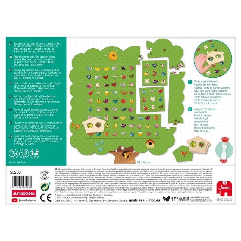 Többféle variáció szerint játszható egyéni, és társasjáték. A lombos fa mintájú játéktáblán kell megtalálni a megfelelő kombinációban a madárkákat, mielőtt leperegne a homokóra! Párosító játékként is használható. Nagyszerűen a fejleszti a szín- és formafelismerést, a kombinatorikát, a gyors gondolkodást és a koncentrációt. Játékidő: kb. 15 perc.
