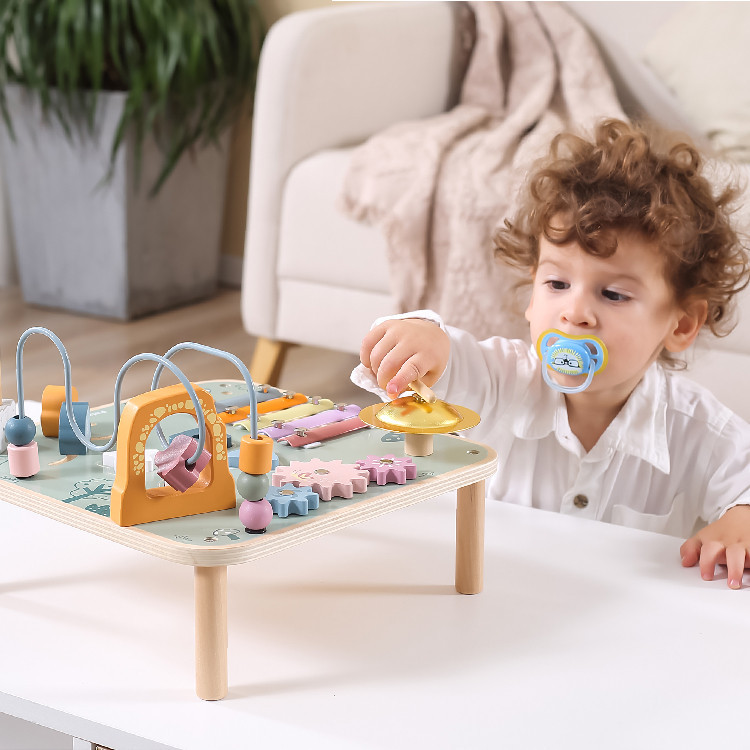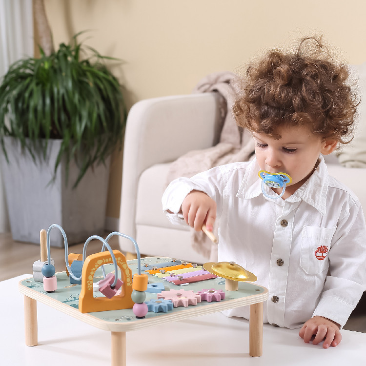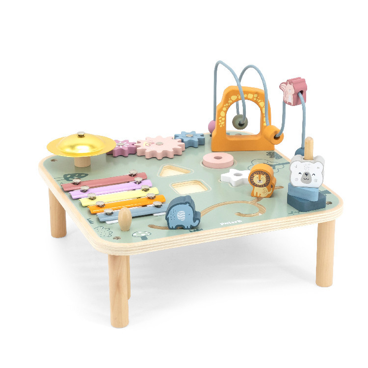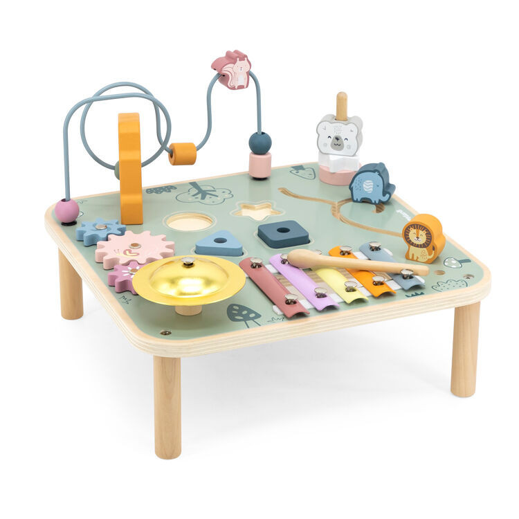 Pasztell színvilágával és faanyag használatával ez a készségfejlesztő játék nemcsak esztétikailag vonzó, de rendkívül tartós is, így hosszú távon szolgálhatja a családokat. Az asztal többféle játékot is kínál, köztük golyóvezetőt, formakeresőt, valamint különböző hangszereket, mint metalofon és cintányér, ami lehetőséget biztosít a gyerekeknek, hogy játék közben fejlesszék zenei képességeiket. Emellett állatos útvesztő játék és fogaskerekek is helyet kapnak az asztalon, amelyek izgalmas kihívások elé állítják a gyerekeket.