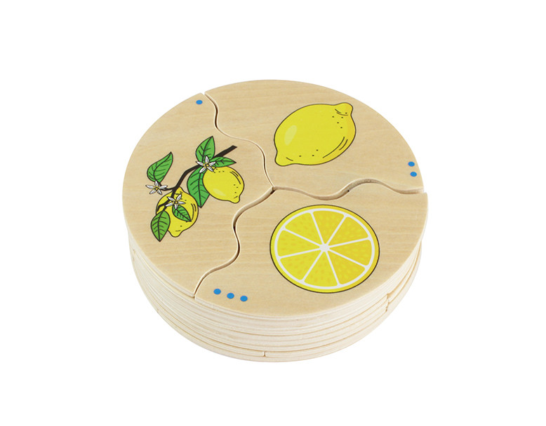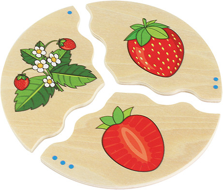 A fából készült, 3 körcikkre osztott kirakón egy adott gyümölcs egész képe, a félbevágott képe és a fán/bokron lógó képe látható.