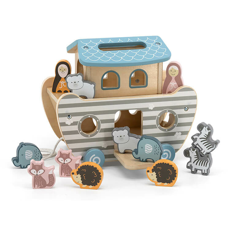 Fából készült Noé bárkája állatokkal. Minden állatból 2 darab található a készletben. A játék lényege: megmenteni minden állatot és feljuttatni Noé bárkájára. Többféle módon lehet a formákat a bárkára juttatni: a formebedobón keresztül, a tetőn át vagy felrakni azokat a fedélzetre. A remek szórakozás során fejlődik a gyermek finommotoros készsége, szem-kéz koordinációja és térlátása. Ezeken felül ismerkednek az állatok, színek és formák elnevezéseivel. Alkalmas lehet a jól ismert bibliai történet megismertetésére.