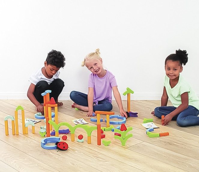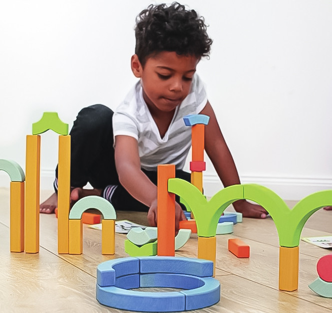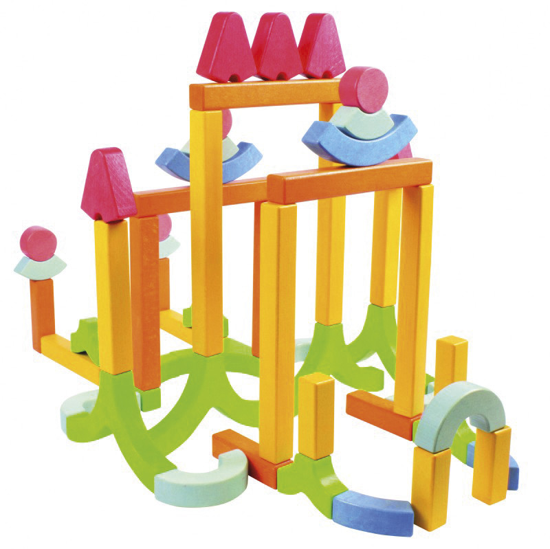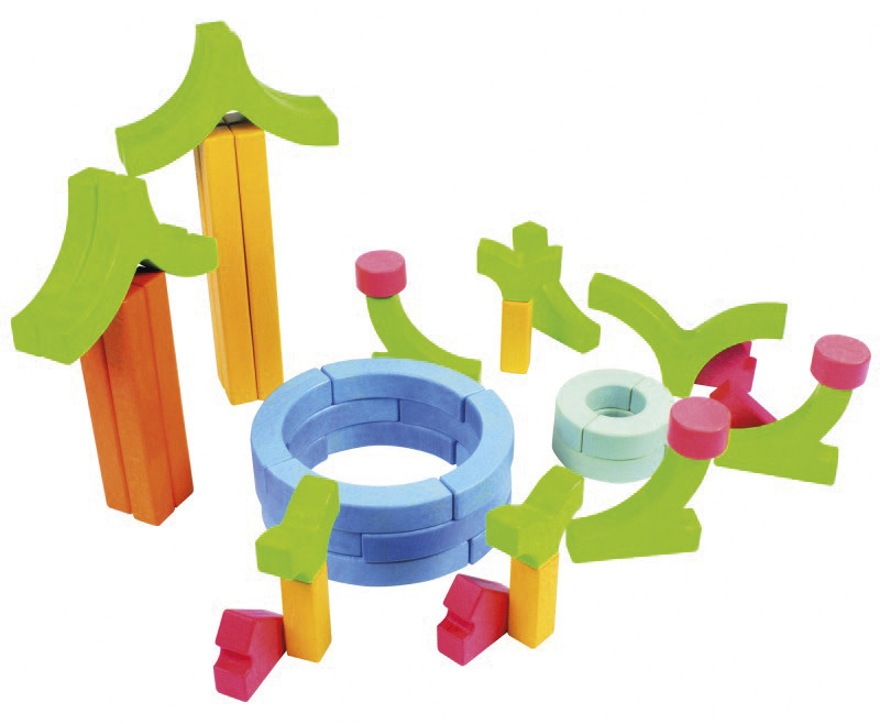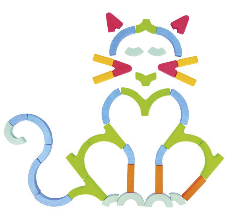A készlet 80 darab, különböző formájú és színű bükkfa építőelemet és 25 db mintakártyát tartalmaz, három nehézségi szinten. A gyerekek szabadon építhetnek síkban (2D) és térben (3D) is, vagy követhetik a mintakártyák utasításait. A játék ösztönzi a kreativitást, fejleszti a problémamegoldó képességet és a kéz-szem koordinációt, miközben a gyerekek játékosan sajátítanak el alapvető matematikai és nyelvi ismereteket.Játékötletek:Szabad építés:A gyerekek szabadon kombinálhatják az elemeket, így saját fantáziájuk szerint hozhatnak létre építményeket (tornyok, házak, hidak, járművek).Fejlesztési fókusz: kreativitás, térlátás, kéz-szem koordináció.Mintakövetés a kártyákról:A 25 mintakártya 3 különböző nehézségi szinten mutat be betűket, számokat, formákat vagy építményeket. A gyerekek feladata ezek pontos lemásolása.Fejlesztési fókusz: vizuális figyelem, logikus gondolkodás, finommotorika, kitartás.Betű- és szókirakás:A betűket formázó elemekből a gyerekek saját nevüket vagy egyszerű szavakat rakhatnak ki.Fejlesztési fókusz: nyelvi készségek, betűfelismerés, helyes sorrend gyakorlása.Számkirakás és mennyiségpárosítás:A számokat mutató mintakártyák alapján a gyerekek kirakják a számokat, majd az adott számértéket ugyanannyi építőelemmel is megjelenítik.Fejlesztési fókusz: számfogalom, mennyiségfogalom, matematikai gondolkodás.Versenyjáték időre:A pedagógus kiválaszt egy mintakártyát, a gyerekek pedig versenyeznek, ki tudja gyorsabban és pontosabban megépíteni a mintát.Fejlesztési fókusz: figyelem, koncentráció, gyors reakció.Színválogatás, formacsoportosítás:Az elemeket szín vagy forma szerint kell különválogatni, csoportosítani.Fejlesztési fókusz: rendszerező képesség, kategorizálás, megfigyelés.Fejlesztési területek összefoglalva:Térbeli gondolkodás és vizuális észlelésFinommotorika és kéz-szem koordinációKreatív problémamegoldásNyelvi és matematikai alapkészségekKitartás, figyelem és együttműködés
