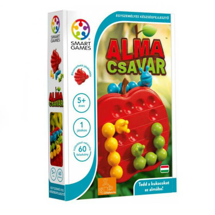 Smart Games, Alma csavar Tedd a kukacokat az almába! A három éhes kukac ugyanabból az almából szeretne lakmározni. Elférnek az almában mindannyian? Ez a logikai játék rugalmas gondolkodást igényel. A kukacok izegnek-mozognak, hajlíthatóak - és az alma játéktábla is! Az "Alma csavar" 60 feladványt tartalmaz, az egyszerűtől az összetettig! Az Alma csavar logikai játék a problémamegoldást, a vizuális észlelést, a tervezést és logikát is fejleszti.