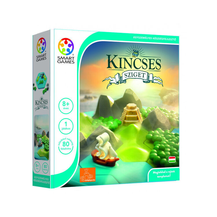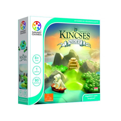 A játék menete: A Kincses sziget célja a titkos templom helyének felderítése a feladványban megadott tippek segítségével. A játék 4 puzzle-darabot tartalmaz, egyedi váltószerkezettel és 1 rögzített darabot (a templommal). 1. Válassz egy feladványt. Minden feladvány egy térképet mutat a szigetről hatszögekre felosztva. Egy hatszög a négy terep egyike lehet: víz (kék), dombok (világos zöld), hegyek (szürke) vagy erdők (sötétzöld). A kincsestérkép gyakran hiányos (fehér hatszögek). A nehezebb feladványok kevesebb utalást mutatnak a terepviszonyokra vonatkozóan. 2. Helyezd el a puzzle-darabokat a játéktáblán úgy, hogy a különböző színű területek a feladatban látható helyekre kerüljenek: •Ha egy hatszög fehér, neked kell kiválasztani, hogy milyen színű terület kerüljön oda. •A templom helyzete soha nem jelenik meg a feladványban. Egy "üres" világoszöld hatszöget fogsz látni helyette, mert ilyen színű a terület, ahol a templom van! •A hajó helyzete szintén nem jelenik meg a feladványban, csak a kék hatszög. •A mozgó puzzle-darabok 4 különböző formába alakíthatóak, az egyes puzzle-darabok két részét mozgatva, egymáshoz forgatva. A templomos darab nem módosítható. •A mozgatható puzzle-darabok két oldalon nyílással rendelkeznek. Csak akkor változtathatod meg a puzzle-darab alakját, ha ezek a nyílások egymással szemben vannak. TIPP: Mielőtt elkezdenél játszani, próbáld ki a 4 különböző lehetőséget minden egyes puzzle-darabon. Minden mozgatható puzzle-darabnak különböző lehetőségei vannak. Mikor minden puzzle-darabot elhelyeztél a játéktáblán és a terepviszonyok megegyeznek a feladatban látható térképpel, megtaláltad a megoldást... és a kincses templom rejtekhelyét is! Minden feladványnak egy megoldása van, amit megtalálsz a füzet végén.
