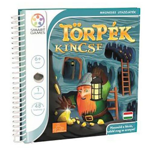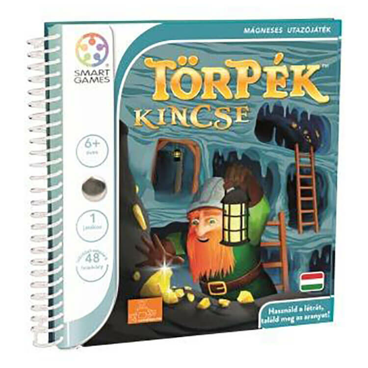 Smart Games, Törpék kincse Indulhat az aranykereső kaland?! A törpék aranyat keresnek a bányában, segítsünk nekik, hogy meg is találják! Helyezzük el a játéktáblán a 3 létrát úgy, hogy kis törpénk le és fel is tudjon mozogni a barlangokban, hogy megtalálja a kincset. Tartalom: - 7 mágneses játékelem - Összecsukható játéktábla - Feladványfüzet 48 feladvánnyal