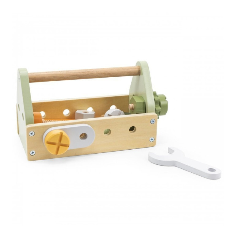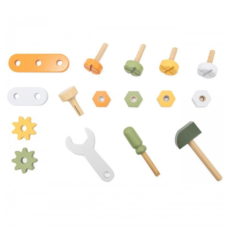 A készlet egy kalapácsot, kulcsot, csavarhúzót, négy pár csavart és anyát, egy csapot, két db fogaskereket és két db lyukas panelt tartalmaz, amelyekkel a gyerekek saját kézműves projekteket hozhatnak létre.