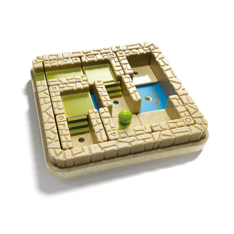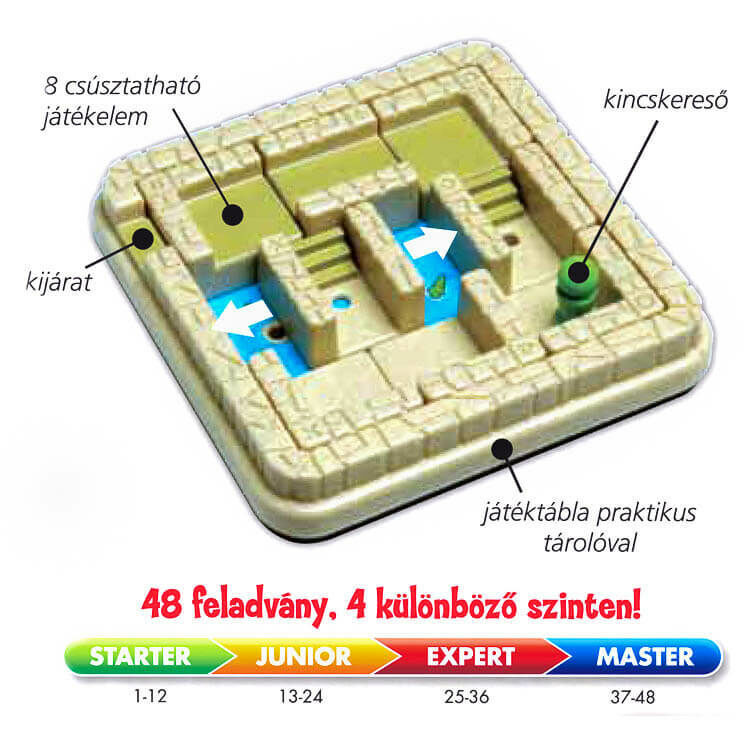 Smart Games, Titkok temploma Ebben a labirintusban a falak folyamatosan mozognak. Egy rossz lépés és mindjárt te leszel a krokodilok vacsorája. Csak egy nagyon okos felfedező tud kijutni a labirintusból! A kisméretű játékok újabb tagja az Indiana Jones-os időket eleveníti fel. Az elemek a tálcában csúsztathatóak, elmozdíthatóak - vagy a falak mozognak, vagy a felfedező. A nem is olyan egyszerűen elérhető célhoz megfelelő előretervezés és kombinációs képesség szükséges. Fejleszti: - logikai következtetést - stratégiai előretervezést - képfelismerést és a térlátást A játék menete Válassz egy feladványt és tedd a játékelemeket (falak és a felfedező) a feladványban látható helyre. Csúsztasd a játékelemeket, úgy hogy a felfedezőt tudd mozgatni: - Az útvesztőnek két szintje van. A szintek között a felfedező csak lépcsőn tud közlekedni. - Amikor a falakat mozgatod, akkor a felfedezőnek egy olyan játékelemen kell állnia, amelyikben van egy lyuk, amibe a felfedező talpa behelyezhető. Nem szabad mozgatni azt a játékelemet, amelyiken áll a felfedező – a lyuk segítségével a felfedező ezt le is zárolja. - A felfedező soha nem kelhet át üres részen (krokodilokkal teli vízben nem tud úszni). Miközben a felfedezővel az útvesztőben keresi a kijáratot, többségében a földszinten fog mozogni. Előfordulhat, hogy felmegy az emeletre, azonban minden esetben csak a földszinten állhat meg. Ezért az elsőn lévő játékelemeken nincs is lyuk a felfedezőnek, így csak áthaladhat rajtuk, de nem állhat meg. - A játékelemeket soha nem szabad kivenni a játéktáblából – mindig csak csúsztatni szabad! Az útvesztő kijárata az emeleten van. Ezért mindig az utolsó lépésnél szükség lesz egy lápcsőre, hogy a felfedező az utolsó pihenőjéről fel tudjon jutni az emeletre egy lépcsőn. Ha a felfedező ki tud szaladni az útvesztőből, akkor megtaláltad a megoldást!